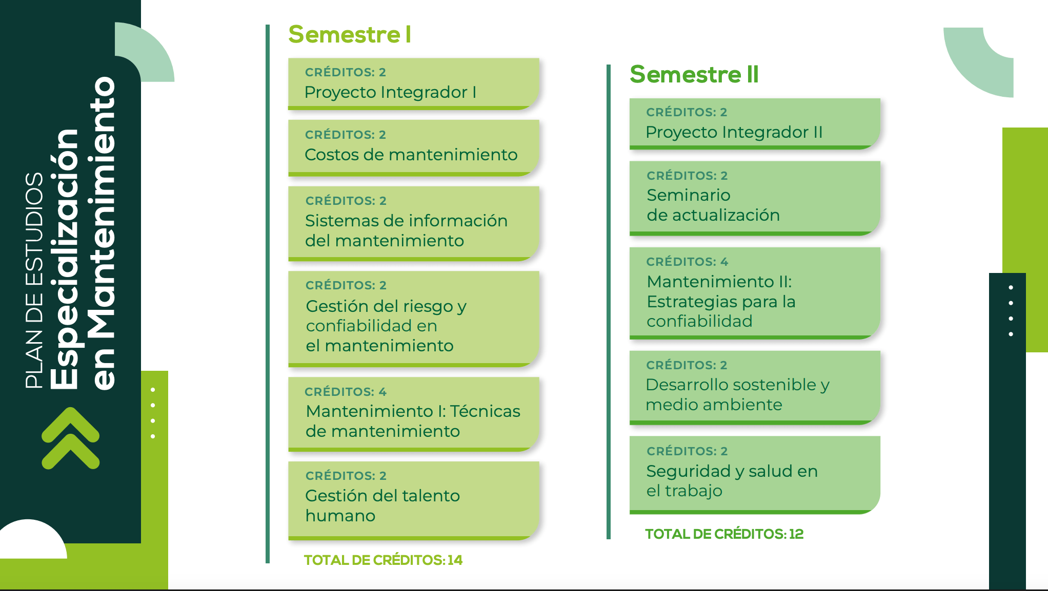 La Especialización Técnica Profesional en Mantenimiento Industrial brinda formación pos gradual a profesionales universitarios, a tecnólogos y técnicos profesionales de las áreas de producción industrial, electromecánica, mecatronica y afines, que requieren profundizar y desarrollar competencias en mantenimiento electromecánico de instalaciones y maquinas industriales, para lo cual cuenta con profesores con amplia experiencia en este campo y con un proyecto educativo que involucra los componentes más relevantes del mantenimiento industrial.